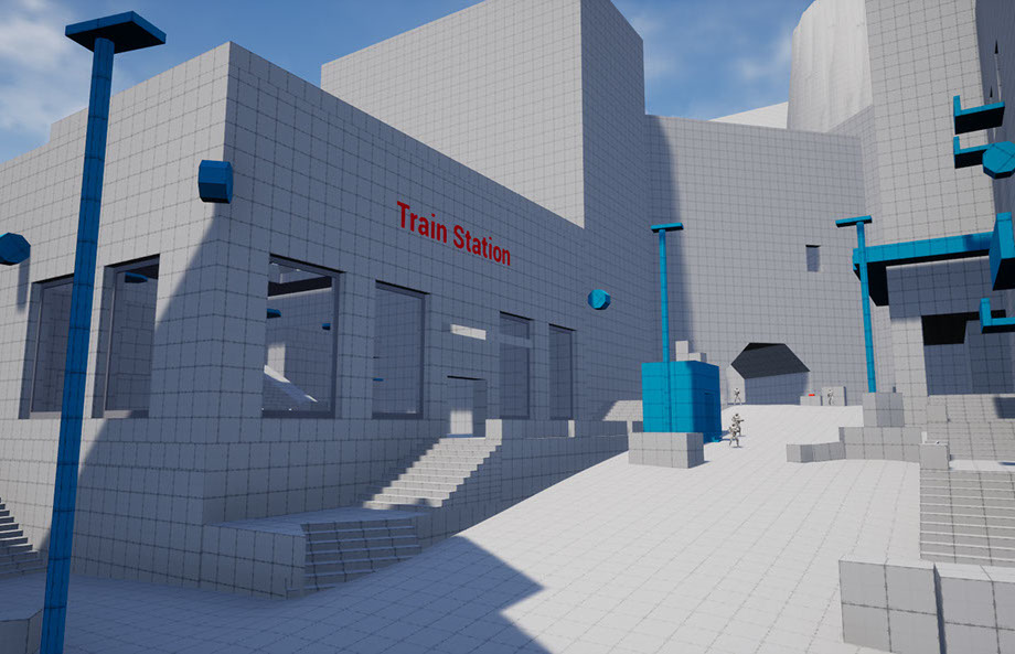 The second part of the level introduces players to the station. Many paths of parkour lead to a vista showing the station. Players should want to look at what's happening, as it's one of the more emblematic buildings than the others. Triggers are placed to allow players to see a scene inside the building. It marks the beginning of the second objective that players can choose to pursue or not.
